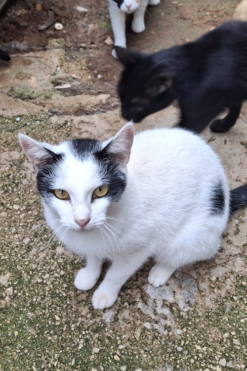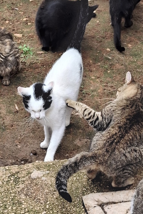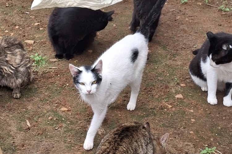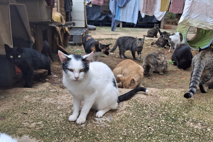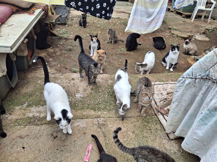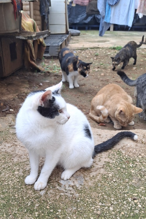 Con tantos gatos, casi nadie llega hasta el recinto exterior. Los visitantes se quedan mirando a los gatos que aún están dentro, y los demás –como Kel– pasan desapercibidos 😿.