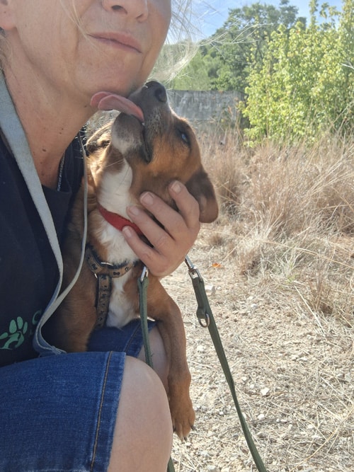 Con las personas se muestra siempre cariñosa, disfruta mucho de los paseos con los voluntarios y no ha mostrado ningún interés negativo hacia los gatos. Además, transmite mucha calma y confianza, lo que la convierte en una compañera ideal para cualquier familia.
