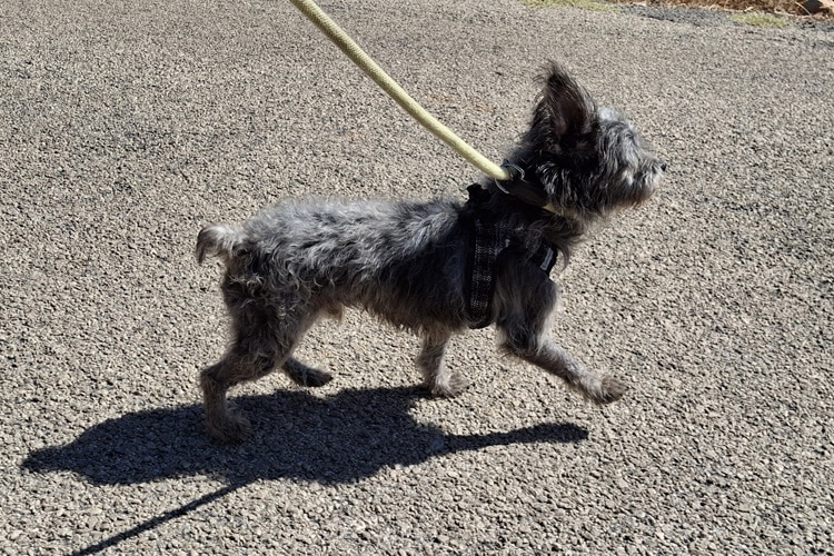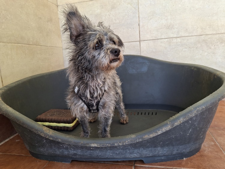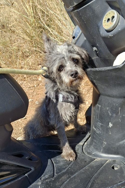 Toni tiene un aspecto muy característico: una de sus orejas se mantiene erguida y además tiene el rabito corto. Un día, al ver un scooter aparcado frente al albergue, quiso subirse enseguida — parece que eso ya lo conocía.